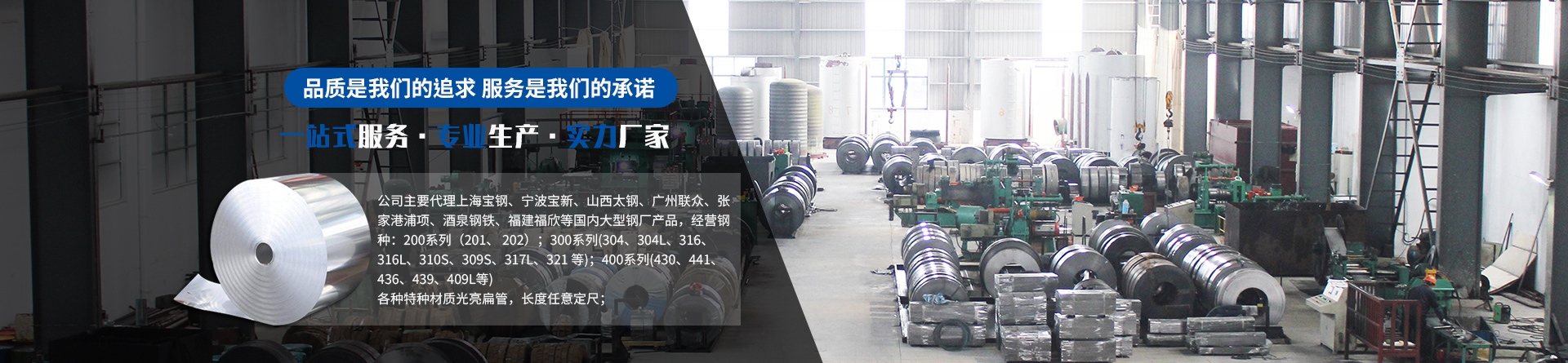 >主要代理上海寶鋼、寧波寶新、山西太鋼、廣州聯(lián)眾、張家港浦項(xiàng)、酒泉鋼鐵、福建福欣等國(guó)內(nèi)大型鋼廠產(chǎn)品,經(jīng)營(yíng)鋼種:200系列(201、 202);300系列(304、304L、316、316L、310S、309S、317L、321 等);400系列(430、441、436、439、409L等);